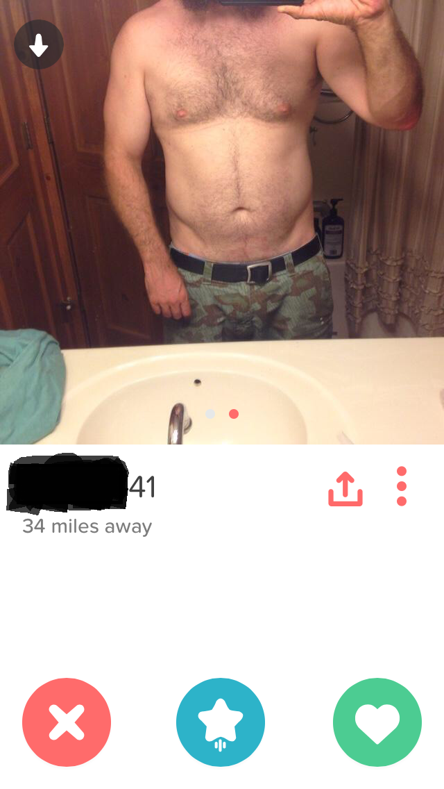 (an aside: I pressed “like” on this profile because I figured he was making fun of the sculpted bro photos that usually populate Tinder and I liked how comfortable he was with his body. His other photo was a beardy smile.)